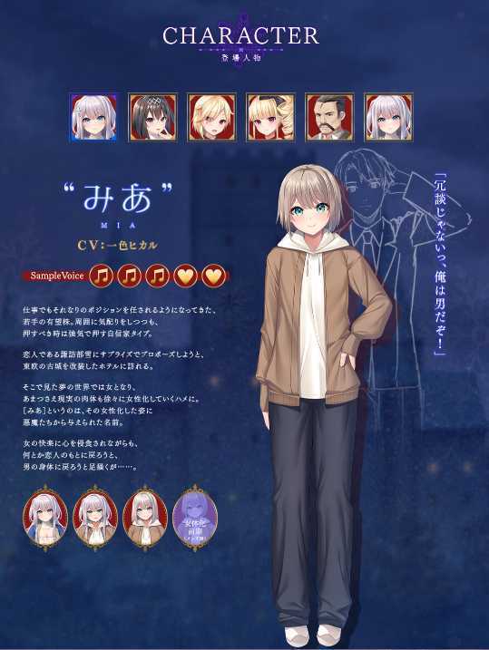 在立绘和事件CG中,描绘了男性主人公逐渐接近女性形象的样子。